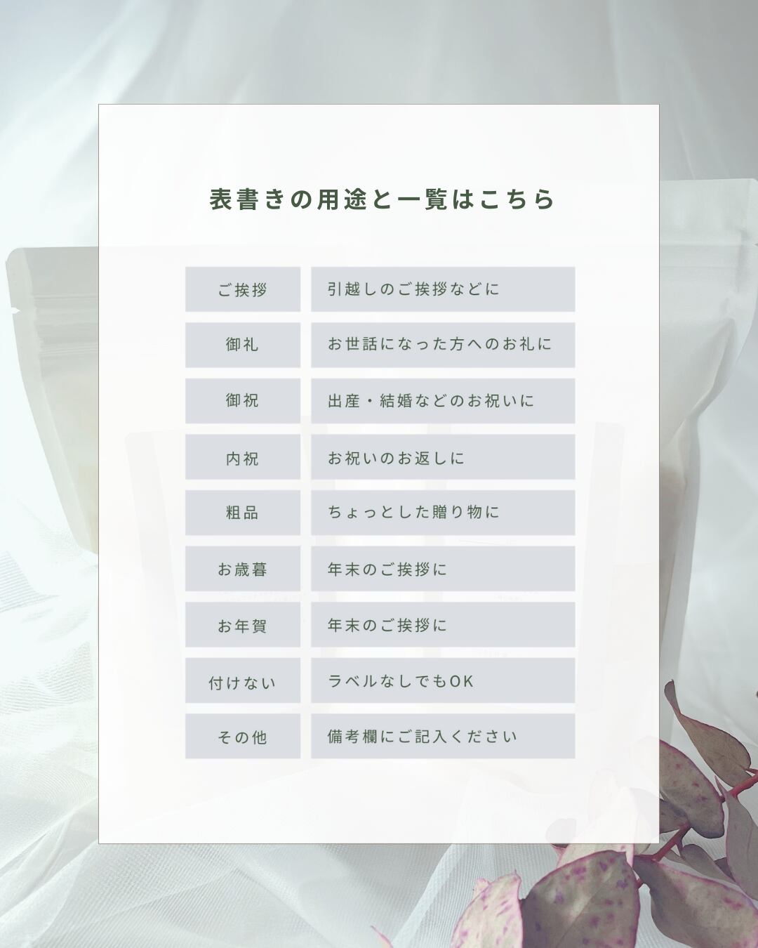 ご挨拶や御礼、内祝いなど、幅広いシーンでお使いいただけます。